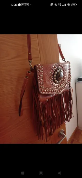 Bolso de cuero con un diseño llamativo y detalles únicos. - Adornado con tachuelas metálicas. - Incorpora flecos largos en la parte inferior. - Cierre con solapa y detalle central circular. Nunca se ha usado.