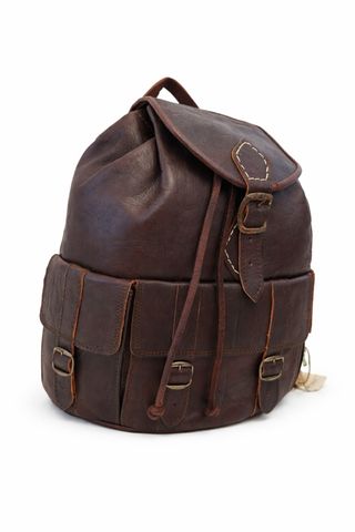 Mochila de cuero con un estilo vintage y un acabado desgastado que le da carácter. - Material: Cuero genuino. - Diseño: Estilo mochila. - Compartimentos exteriores con solapa y hebilla.
