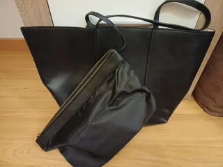 Bolso tipo capazo de gran tamaño, en color negro. Recto por delante, un poco redondeado por detrás. Incluye un neceser interior, con cremallera, que se puede quitar. Es rígido, sin cremallera , ni clip para cerrar . Ligero. TIENE DENTRO UNAS MARCAS , QUE DEBEN SER DE ESTAR GUARDADO. SIN ESTRENAR. NUEVO. MARCA ZARA. ENTREGA EN MANO. NO ENVIO. - Material exterior: cuero sintético. - Cierre de cremallera en la bolsa interior. - Asas cómodas para llevar al hombro.