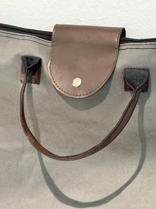 Bolso de mano grande en color beige con detalles en marrón. - Cierre de cremallera. - Solapa con botón a presión. - Asas de cuero. - Incluye etiquetas.