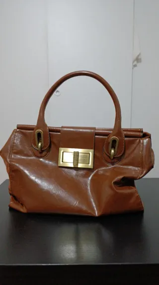 Bolso grande de cuero con un diseño elegante y espacioso. - Material: Cuero. - Color: Marrón y beige. - Cierre con solapa y broche metálico.