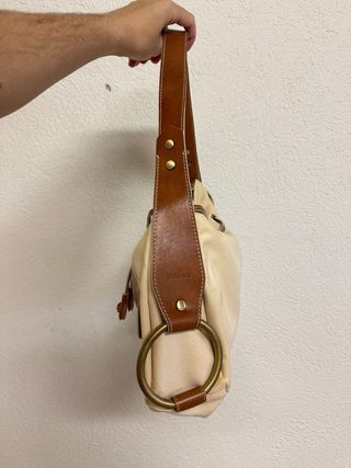 Bolso original de la marca Hogan en lona beige con detalles en piel marrón. Diseño tipo hobo, amplio y cómodo, perfecto para el día a día. Cuenta con dos bolsillos frontales con solapa y cierre de botón, asa ancha de piel con detalles metálicos dorados y grandes aros laterales. Cierre superior ajustable con cordón de piel y borlas decorativas. Interior espacioso, ideal para llevar todo lo necesario. Marca: Hogan Color: Beige con detalles marrón cuero Material: Lona y piel auténtica Cierre: Cordón ajustable Bolsillos: 2 frontales con solapa y botón Detalles: Asa ancha de piel, aros metálicos dorados, borlas decorativas