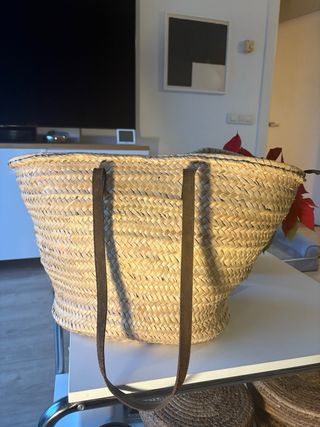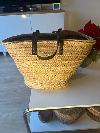 Preciosa cesta de mimbre con asas de cuero. Ideal para ir a la playa o de compras. - Asa de cuero marrón. - Mimbre beige. - Cesta grande y espaciosa. - Perfecto estado.
