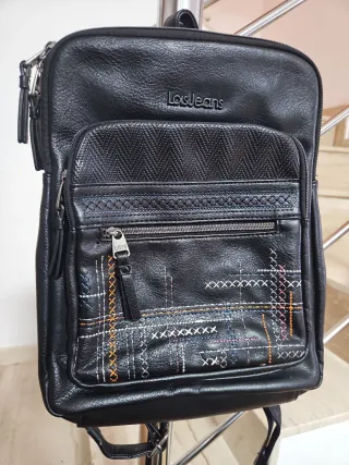 Mochila original de la marca Lois Jeans con un diseño único. - Cuero sintético - Color negro con detalles bordados multicolor. - 3 Compartimentos frontales con cremallera. - Bolsillo interior con cinta de seguridad para portátil - Cremalleras plateadas con tiradores de cuero. Muy poco uso