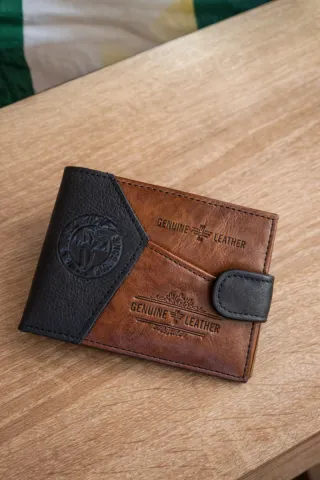 Elegante billetera de cuero genuino con un diseño bicolor. - Material: Cuero genuino. - Diseño: Combinación de tonos marrones y negro. - Detalle: Grabado Genuine Leather.
