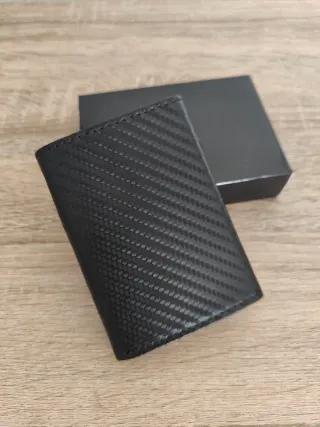 Nuevas, con caja. Elegante cartera tarjetero automática compacta con compartimento para monedas. - Material de cuero PU anti huellas de calidad con textura de fibra de carbono en color negro. - Tarjetero con mecanismo automático de aleación de aluminio anodizado con tecnología de bloqueo RFID para protección de datos de tarjeta,más tres compartimentos internos para DNI (con hueco digital para facilitar su extracción), tarjeta sanitaria y conducción. -Amplia billetera independiente como en una cartera convencional poco habitual en este tipo de tarjeteros para evitar pérdidas. -Monedero posterior. -Cierre magnético de banda
