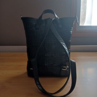 Bolso de la marca Francesco Biasia con un diseño único que combina cuero negro y tejido de punto marrón. - Cierre de cordón. - Detalle decorativo en la parte frontal. - Correas ajustables.