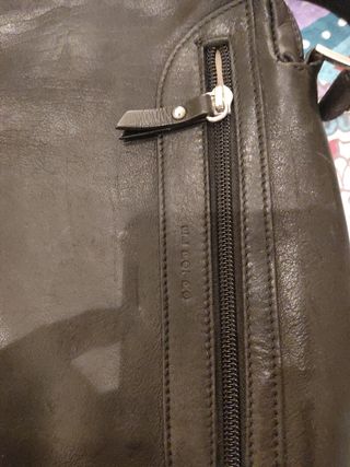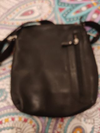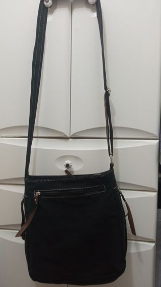 En excelente estado. Tela negra,correa con detalle en marron-color cuero. Capacidad-Muy ligero, no pesado .2 amplios bolsillos exteriores con cremallera.2 bolsillos interiores(ver fotos). Tamaño un poco ampliable si abres cremallera lateral que recorre todo el bolso. Enseño en Bilbao ,Bizkaia, o envío.