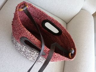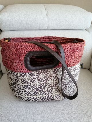 Capazo para llevar colgado al hombro o en la mano con asas. Tiene una correa de cuero. Es bicolor, teja y blanco y negro. Esta nuevo.