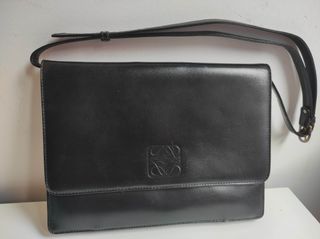 Bonito bolso vintage de Loewe 1846 de cuero negro. Combinable con todo tipo de looks, desde diario hasta eventos. Y con medidas muy cómodas. Con asa para llevar al hombro, que se puede quitar para usar como bolso de mano. Hebilla de metal en color dorado. Cierre con solapa con imán y dos bolsillos interiores (uno de ellos con cremallera). El interior está desgastado por uso (ver fotos) pero el exterior está en buenas condiciones. Medidas: 26 cm largo x 20 cm alto x 3 cm ancho.