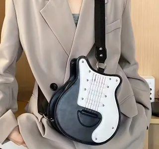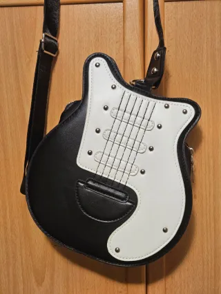 Bolso en forma de guitarra, de cuero sintético (polipiel). Bicolor: blanco y negro. Está nuevo, sin estrenar.