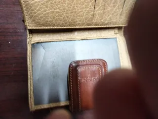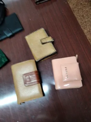 Lote de billeteros a 2 euros cada uno. Tienen algún defecto como se ve en las fotos - Billetero de cuero marrón con cierre de botón. - Billetero de cuero beige con pespuntes y cierre de solapa. - Billetero rosa con detalle de marca. - Billetero negro.
