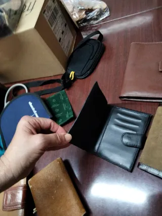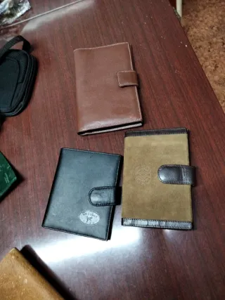 Conjunto de carteras para tarjetas, ideales para organizar tus documentos. - Cartera de cuero marrón.12 euros a estrenar - Cartera de cuero negro con logo.5 euros a estrenar - Cartera de cuero y ante marrón. 12 euros