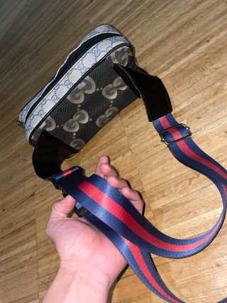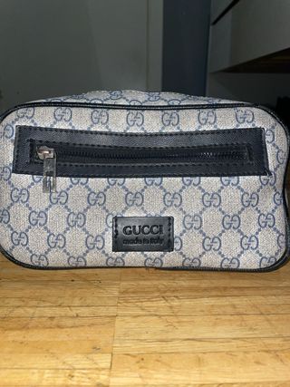 Bandolera de la marca Gucci con un diseño GG característico. - Estampado GG en beige y azul. - Detalle de etiqueta de cuero negro con logo. - Cremallera frontal.