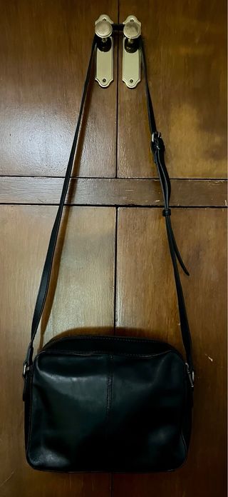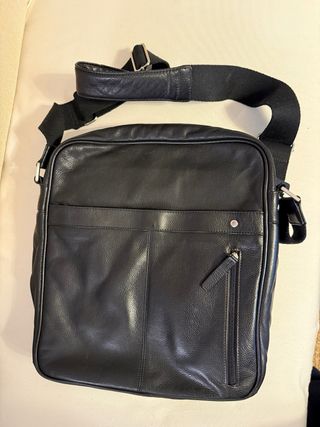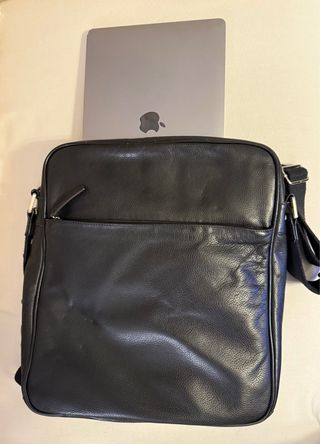 Bolso Bandolera de cuero de la conocida marca Marshall Bergman de Londres. Multiples bolsillos y espacios para portatiles, agendas, plumas y lapices. Dimensiones:38x33x6 cm