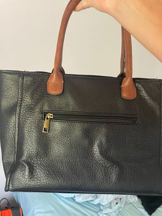 Precioso bolso de mano, ideal para el día a día. Es de color negro y marrón, con un diseño elegante y práctico. - Asa de mano resistente. - Bolsillo frontal con cierre. - Material de imitación de cuero de textura agradable.