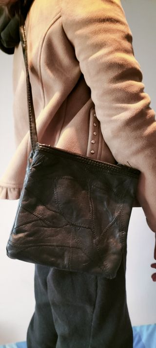 Bolso pequeño de cuero con un diseño de parches. - Material: Cuero - Cierre principal con cremallera - Tres compartimentos con cremallera
