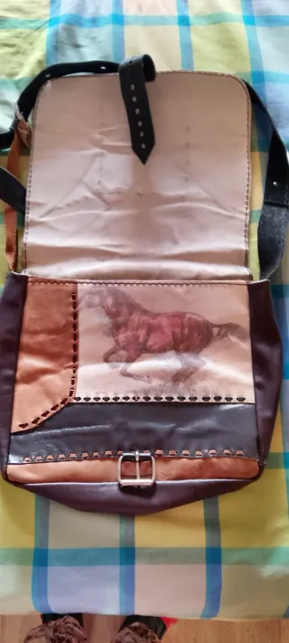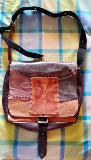 Bolso bandolera amplio de cuero con un diseño patchwork único, y serigrafia de una mujer y un caballo. Contiene un pequeño bolsillo interior. Dimensiones en cm largo: 35 alto: 31 ancho: 10 - Elaborado con diferentes piezas de cuero. - Correa ajustable para mayor comodidad. - Cierre con hebilla. - Costuras visibles que añaden un toque artesanal. - marcas de uso visibles en las fotos. Comprado en Polonia.