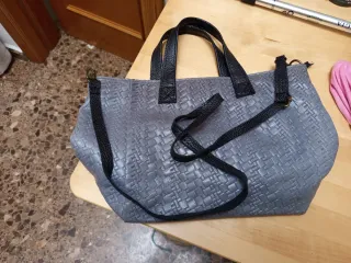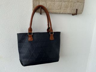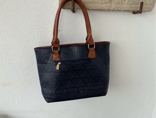 Elegante bolso de mano para mujer con un diseño moderno. - Acabado texturizado con patrón geométrico. - Combinación de colores azul y marrón. - Asas de cuero sintético. - Cierre de cremallera. - no se ha usado casi nada
