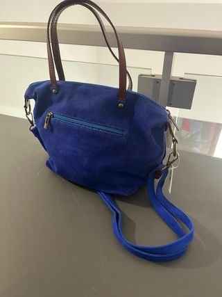 Bolso de mujer con un diseño llamativo. - Material exterior de ante azul. - Adorno de estrella dorada en la parte frontal. - Asas de mano en cuero marrón. - Correa ajustable para llevar cruzado.