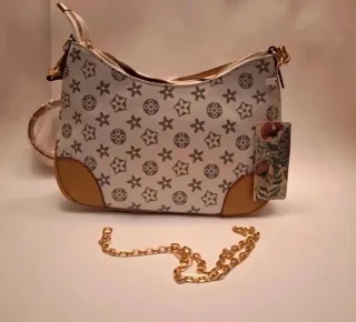 Bolso de mano para mujer con un diseño elegante y estampado. - Color base beige con detalles en cuero sintético. - Estampado de flores y monogramas. - Incluye una etiqueta decorativa floral. - Cadena dorada para llevar al hombro o cruzado.