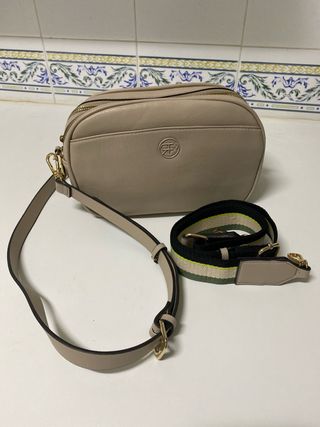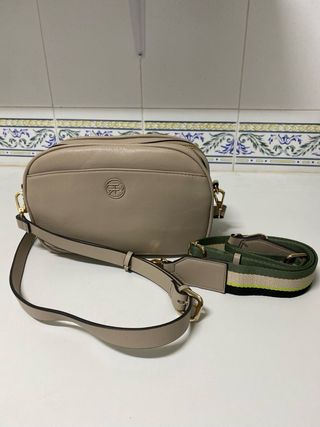 Bolso de mano o bandolera con un diseño elegante. - Compartimento principal con cierre de cremallera. - Incluye dos correas: una de cuero beige y otra de tela multicolor. - Detalle de logo circular en la parte frontal.