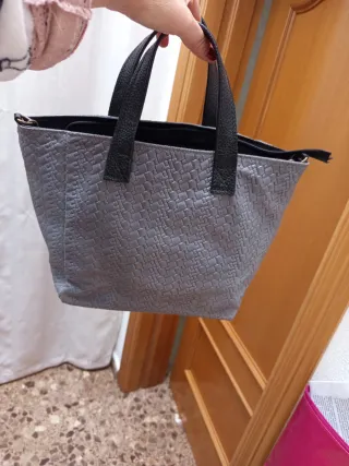 Bolso de mano con un diseño texturizado y asas de cuero. - Color gris con detalles en negro. - Textura de pequeños cuadrados. - Asas de cuero negro.