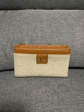 Monedero de mujer con un diseño bicolor. - Parte superior en cuero marrón. - Cuerpo principal en tela beige. - Cierre de botón a presión.