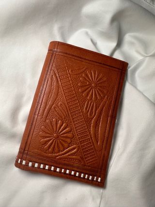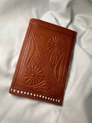 Elegante cartera de mujer con un diseño grabado. - Material: Cuero - Color: Marrón - Diseño floral y geométrico - Acabado artesanal