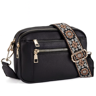 Bolso Bandolera para Mujer, color Negro, Correa Ancha Ajustable con Diseño Floral, Colgante Decorativo Incluido, Múltiples Compartimentos con Cremallera, Ideal para Compras, Viajes y Trabajo. Mide 22 x 15.6 x 5 cm. Esta fabricado con cuero PU de la mejor calidad. Tiene 4 cremalleras doradas externas, y dos bolsillos internos, uno con cremallera. La correa mide 151.2 cm, fabricada en raso con terminaciones en cuero y metalicas resistentes. El colgante esta fabricado a mano por Abuyita con diversas texturas y borlas de madera.