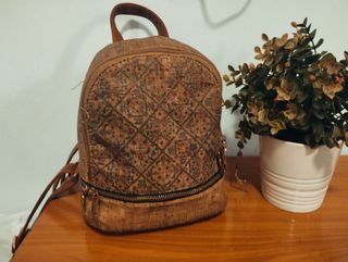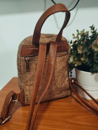 Mochila de material con asas de cuero, largo ajustable. Bolsillo y bolsillo con cremallera parte interior. También cremallera en la parte trasera. Base rígida también de cuero y detalles de 4 puntos dorados para apoyar