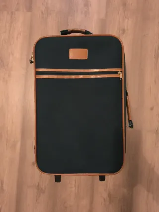 Medidas 57x21x36 Maleta de estilo vintage con detalles en cuero. No se aprecia en las fotos pero es verde - Diseño clásico. - Asa superior. - Ribetes marrones.