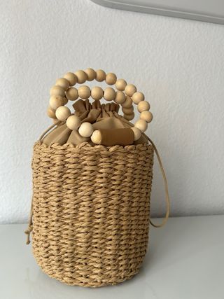 Bolso de rafia con un diseño único y veraniego. Perfecto para llevar tus esenciales con estilo. - Material exterior: rafia tejida. - Asas superiores: cuentas de madera. - Cierre: cordón. - Detalle: tira de cuero en la parte superior.