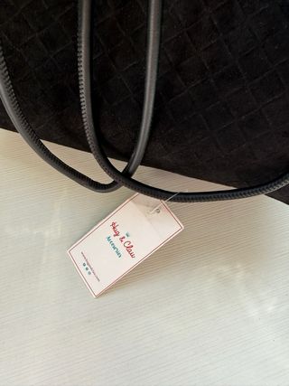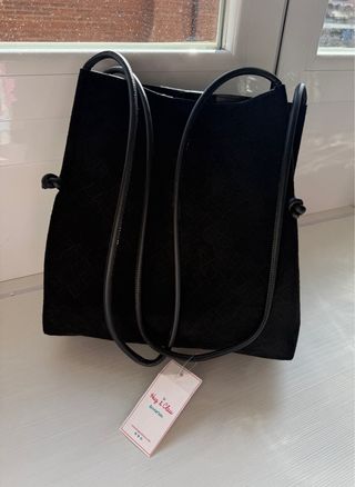 Bolso de mano negro con un diseño texturizado. - Material: Ante - Asas de cuero - Cierre de cordón - Detalle de nudos laterales