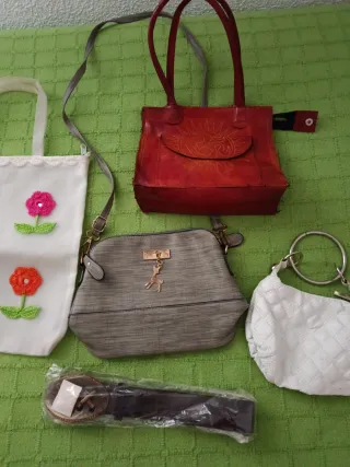 Conjunto de accesorios de moda, incluyendo bolsos y un cinturón, todos a estrenar. - Bolso blanco con flores de ganchillo. - Bolso gris con detalle metálico. - Bolso rojo con relieve. - Bolso blanco pequeño con asa de aro. - Cinturón de cuero marrón.