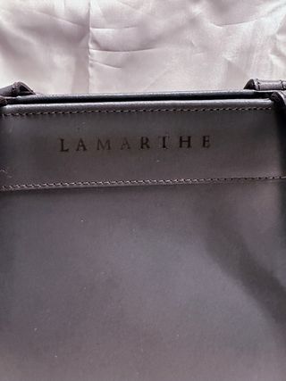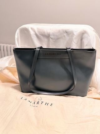 Bolso azul petróleo (grisáceo), marca Lamarthe, cierre de cremallera. 2 Asas de 56 cm. Bolsillo interior con cremallera. Medidas: Ancho 36cm. Alto 20cm. Fondo 10’5 cm.