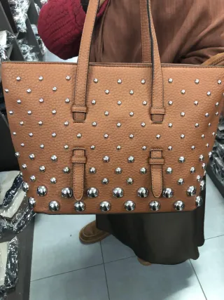 Bolso de mano de cuero sintético en tono marrón, adornado con tachuelas plateadas. - Diseño con tachuelas de diferentes tamaños. - Asas resistentes para llevar al hombro o en la mano. - Acabado texturizado del material.