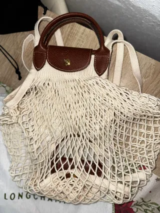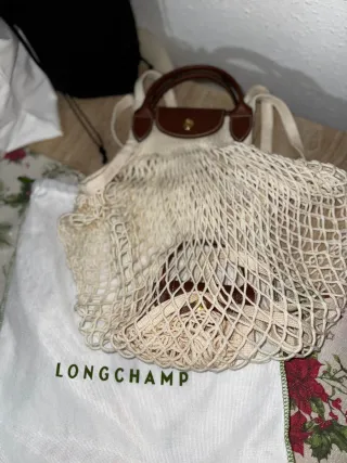 Bolso de la marca Longchamp con un diseño de red. - Color beige y marrón. - Asas de cuero.