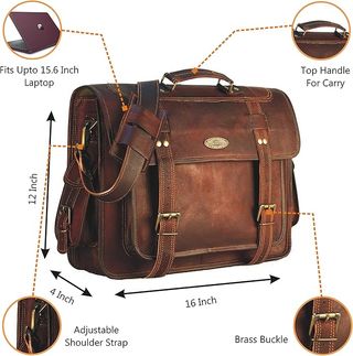 📏 Dimensiones y capacidad: Mide 30.5 x 4.5 cm, ideal para portátiles de hasta 15.6 pulgadas con espacio extra para tablets, cargadores y accesorios. 🛠️ Calidad artesanal superior: Fabricado en cuero genuino de alta durabilidad con forro de lona y acabados naturales únicos que garantizan resistencia. 💼 Comodidad y versatilidad: Incluye una correa acolchada ajustable, siendo el compañero perfecto para viajes de negocios, oficina o uso escolar. 🗄️ Organización inteligente: Cuenta con 3 compartimentos principales y múltiples bolsillos internos y externos para organizar llaves, cartera y otros objetos personales.