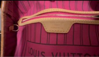Bolso Louis Vuitton con interior en color rosa vibrante y exterior en tono marrón clásico. Presenta un diseño elegante y espacioso, ideal para el día a día. - Interior forrado en tela rosa. - Detalle de etiqueta de cuero con logo grabado. - Cremallera metálica plateada.