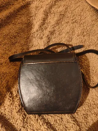 Bolso de cuero con un diseño clásico y elegante. Ideal para complementar cualquier atuendo. - Material: Cuero genuino. - Cierre con hebilla dorada. - Correa ajustable para llevar al hombro. Compartimento trasero. Bolsillo interior con cremallera. 21cm largox20 cm ancho