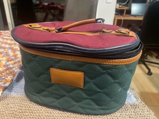 Neceser rígido con un diseño elegante y práctico. - Combinación de colores verde y burdeos. - Asa superior de cuero. - Detalle de etiqueta de cuero. - Cierre de cremallera. Medidas 30x20x15 Envios a partir de compras de 10€