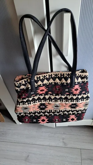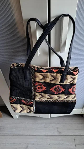 Bolso con un diseño patchwork único y llamativo. - Combinación de texturas y estampados étnicos. - Asas de cuero sintético negro. - Detalles de costura decorativa.