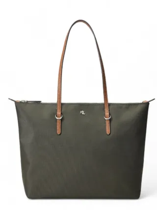 Bolso tote mediano Ralph Lauren Keaton. - Material de nylon 100% reciclado. - Resistente. - Color verde oliva. - Asas de cuero marrón.