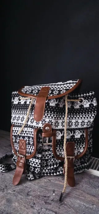 Mochila con un diseño étnico en blanco y negro, con un patrón de elefantes y detalles en cuero sintético marrón claro. Agradabke al tacto. Cierre de cordón dorado y solapa con hebillas. Correas ajustables para mayor comodidad. Medidas: 28x26x16cm.