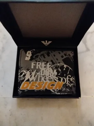 Cartera de cuero sintético con un diseño moderno y estampado gráfico, con caja original - Material: Cuero sintético. - Color: Negro. - Diseño: Estampado distintivo.