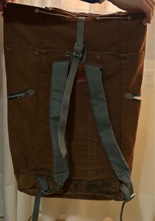 Mochila de estilo vintage, ideal para excursiones y actividades al aire libre. Su diseño clásico la hace única. - Material resistente de lona. - Compartimento superior con cremallera. - Bolsillos laterales con cremallera. - Refuerzos de cuero en la base y detalles. - Cuerdas y correas de ajuste.