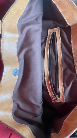 Bolso artesanal de cuero con un diseño único. - Material: Cuero genuino. - Acabado: Marrón natural. - Interior forrado.