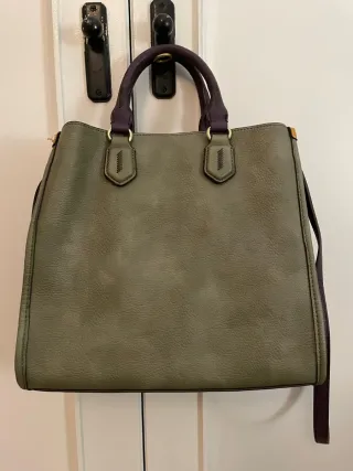 Bolso de mano Abbacino con un diseño elegante y moderno. - Color gris verdoso principal con detalles en morado. - Asa de mano y correa. - Acabado texturizado en el cuero. - Detalle metálico con logo en la parte frontal. Bolso interno de lona en color mostaza. Cierre con cremallera.