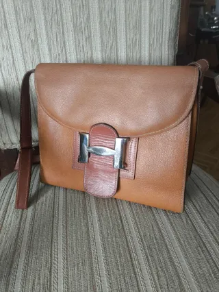Bolso vintage de piel con un diseño elegante y hebilla distintiva. - Material: Piel y cuero. - Color: Marrón y dorado. - Cierre con hebilla metálica. - Correa ajustable.